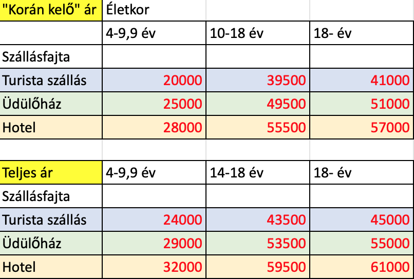 Idén is van „korán kelő” kedvezmény. Amennyiben április 30-ig jelentkezel, a kedvezményes ár vonatkozik rád. Ha április 30. és május 31. között jelentkezel, a „teljes ár” vonatkozik rád. (0-4 éves kor közt ingyenes a részvétel.)
